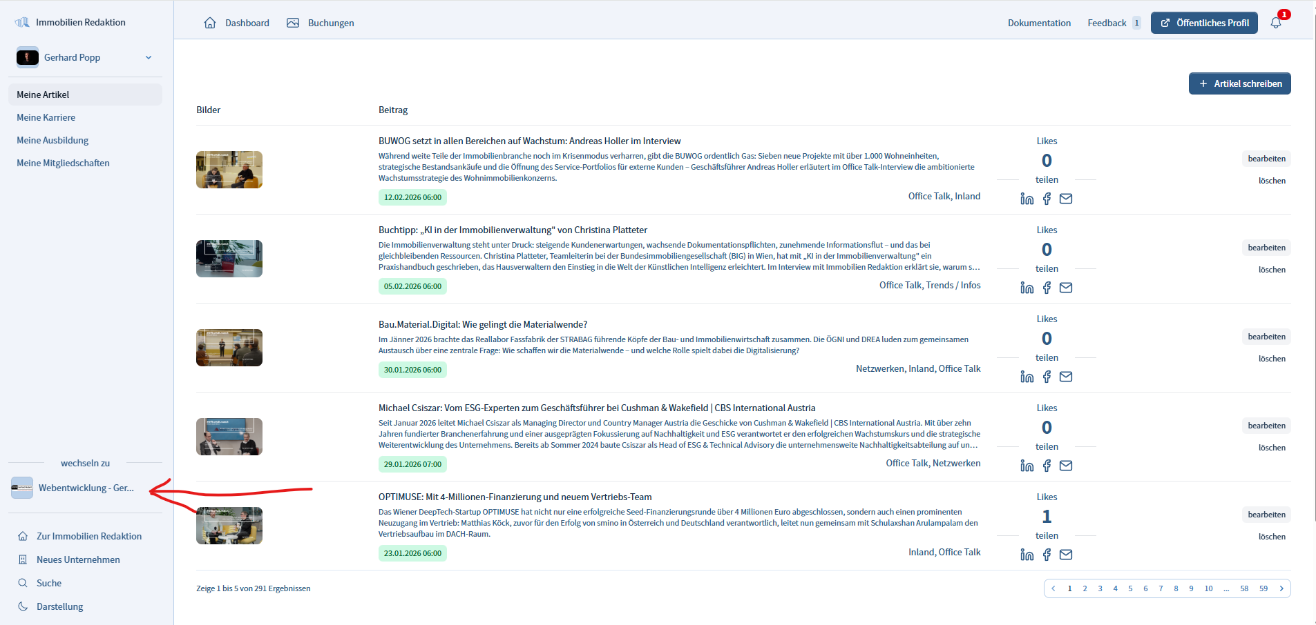 Zum Bearbeiten deines Unternehmens bitte nach Login, oben in der Menüleiste, auf den grünen Button "Meine Immobilien Redaktion". Damit gelangst du in unsere neue Admin-Oberfläche.