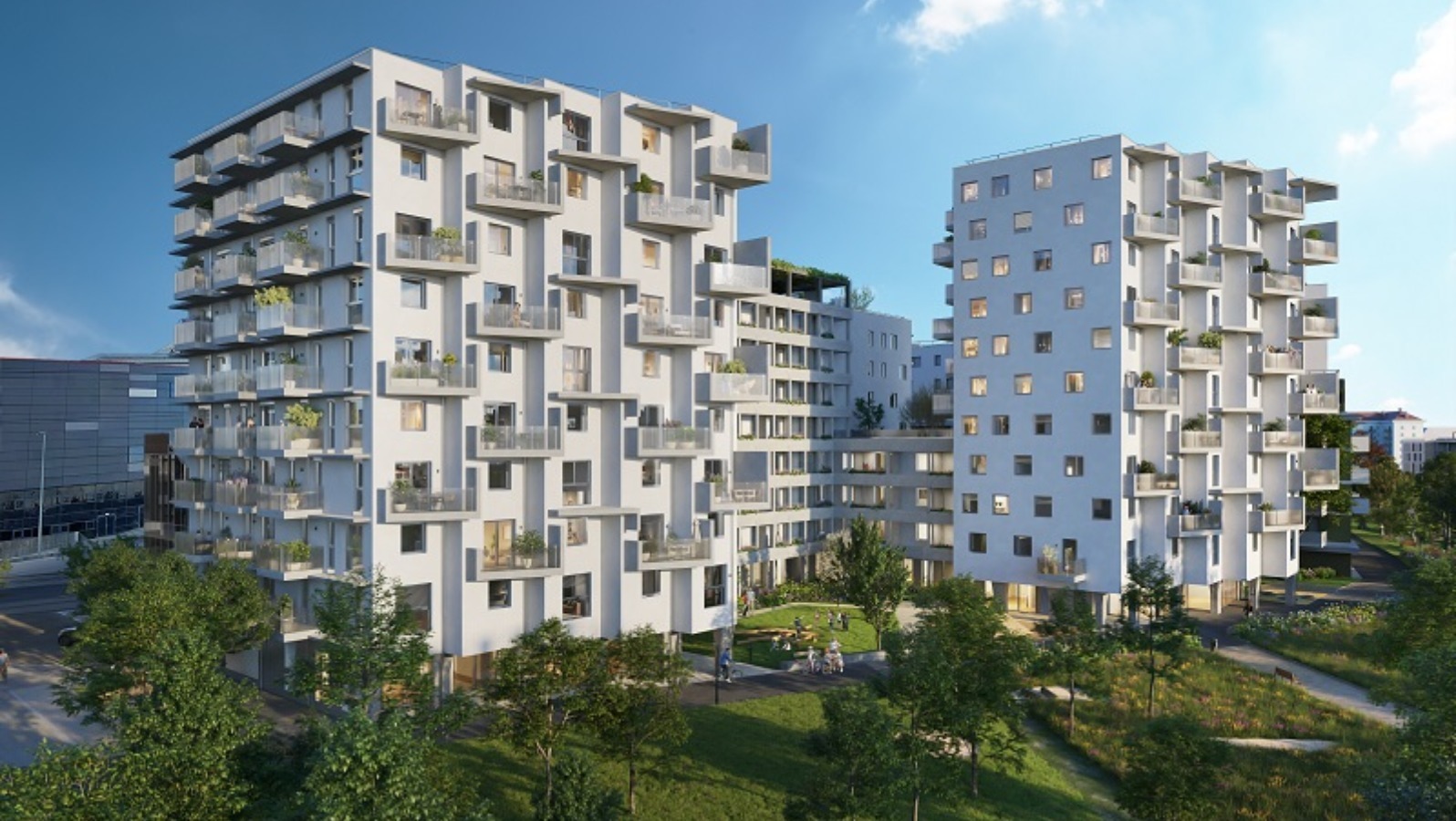 Im achten Obergeschoss wird eine großzügige Gemeinschaftsterrasse mit schattigen Pergolen und gemütlichen Sitzgelegenheiten geschaffen – der ideale Ort für gesellige Stunden. Zudem bietet das Quartier einen Kinder- und Jugendspielplatz sowie einen Gemeinschaftsraum im Erdgeschoss für Veranstaltungen und Zusammenkünfte.